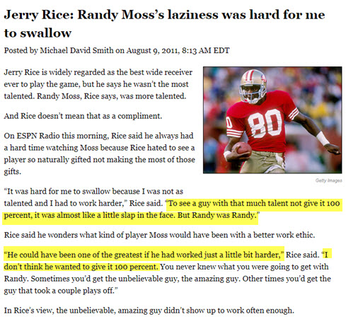 A 2001 article, John? Jerry Rice says Moss could be one of the greatest? Jerry was indeed the best but Randy doesn't look out of place at the next level.