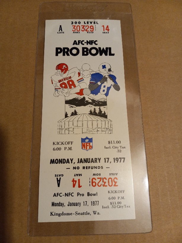 Seattle hosted the Pro Bowl in January 1977, a prime time Monday Night game on ABC. A school friend of mine gave me an extra ticket courtesy of his uncle. I had planned on going with them but I had driver's ed that night and my parents said NO. I did get to see a good chunk of the game on television. I still have the unused ticket.