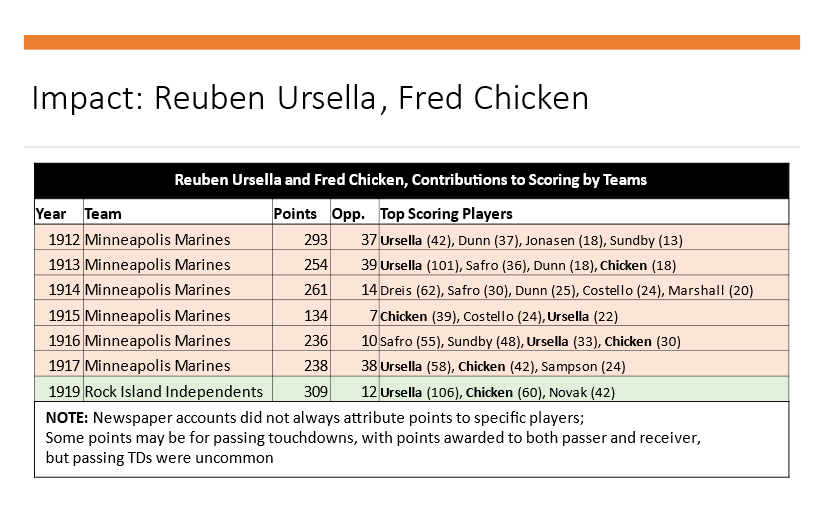 Remember, the height of the Minneapolis Marines was around 1916, and their reputation as a pre-war powerhouse under Ursella's leadership carried them into the NFL, where they did not do as well, mainly because Ursella and a few others had gone to play for Rock Island, instead. During those years Ursella and the others were in Rock Island, the Independents were very, very good.