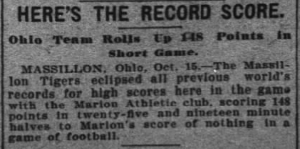 In 1904, the Ohio League got a few national headlines when Massillon scored 148 in a game against the Marion Athletic Club. The clipping below was from a newspaper in Chicago. Several other papers picked up the same short note: