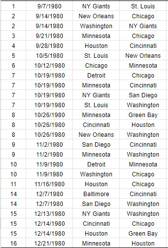 Bears (pre-1982), Redskins (pre-1981), Oilers (pre-1978), Saints, Falcons and Cardinals (pre-1983), all Bengals/Chiefs matchups pre-1988 games, several Chiefs 1984-1987 games, Bengals/Oilers matchups pre-1983, lots of Bengals games (pre-1982), Giants and Vikings (pre-1981), three 1980 Chargers games (vs. NYG, at Cin, at Wash) and some pre-1980 Colts games.